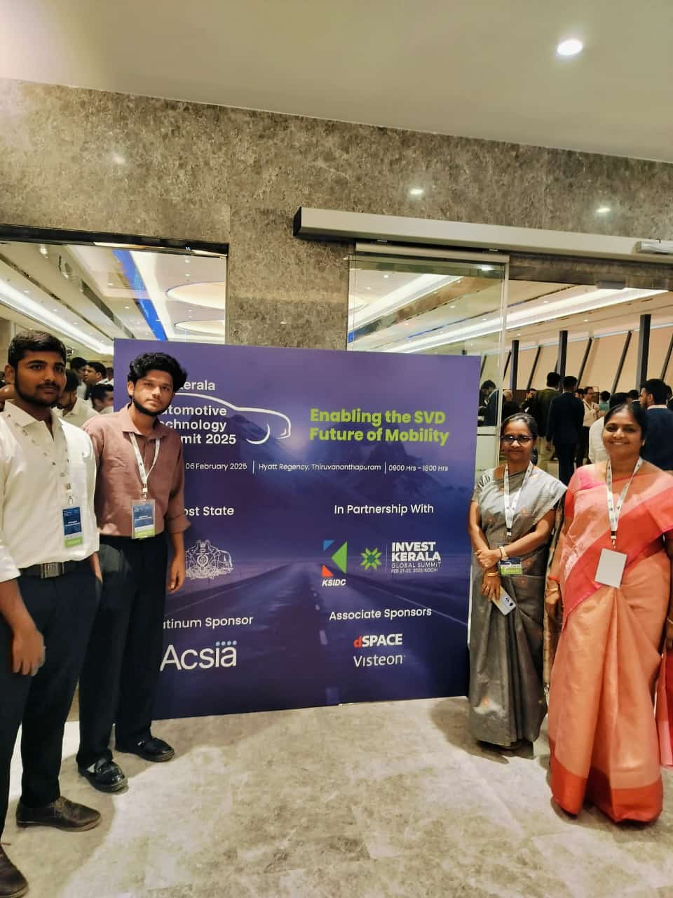 CII Kerala organized an Automotive Technology Submit 2025 on 06 Feb 2025 on the topic of "Enabling the SDV Future of Mobility". In this regard, Dr. M. Senthamil Selvi , Prof & Head Dept of IT, Dr.R.Anuradha, Professor from CSE and student members G.Dharanidharan, III Year EEE ,K.N.Vishwakanth, III Year EEE are participated on the event and explore the automotive technology conference and Future SDV Launch and career opportunities in EV Industries.